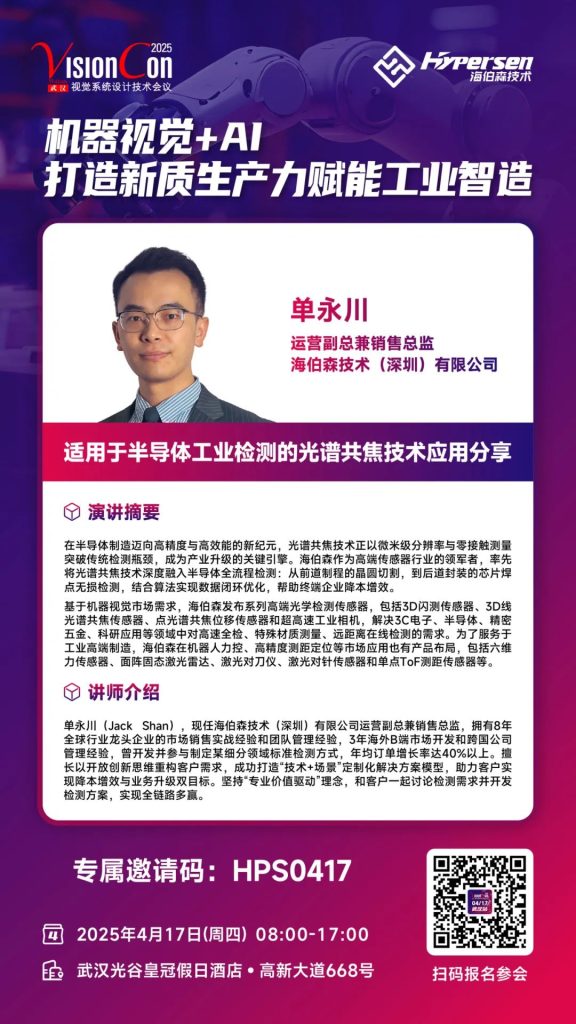 VisionCon視覺系統(tǒng)設(shè)計(jì)技術(shù)會(huì)議是視覺技術(shù)領(lǐng)域的重要會(huì)議之一,匯聚了來自學(xué)術(shù)界、工業(yè)界和科研機(jī)構(gòu)的頂尖專家與企業(yè)代表。海伯森受邀參與此次會(huì)議,分享在視覺系統(tǒng)與傳感器技術(shù)融合方面的研究成果。