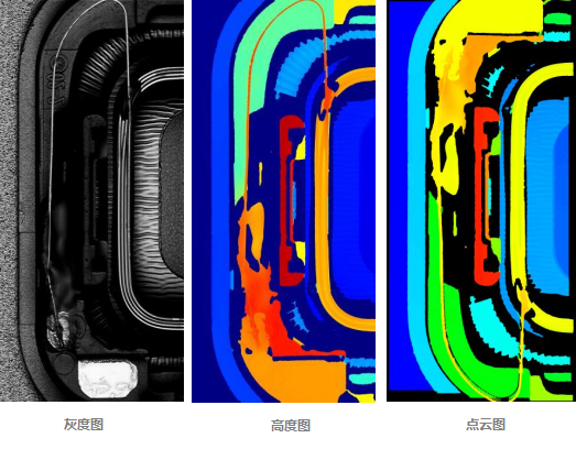HPS-DBL60基于結(jié)構(gòu)光原理,具備識別精度高、測量視野廣和檢測節(jié)拍快等特點,重復(fù)測量精度可達到1μm,1秒內(nèi)可完成超高速拍攝,通過HPS-NB3200控制器的編碼解析與3D點云重構(gòu),得到下方圖示的點云數(shù)據(jù):