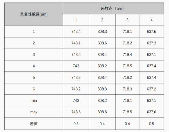 由所有測量數(shù)據(jù)分析可知,海伯森點光譜共焦位移傳感器測量金屬散熱片所有 18 個點位的數(shù)據(jù)的重復(fù)精度能夠達到 0.7um 以下。