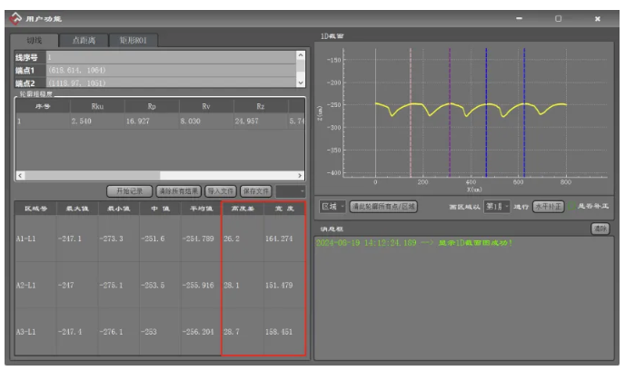 用LCX1000掃描光學(xué)板上表面圖像可以清晰得到凹槽的輪廓,凹槽的深度、寬度可用我們客戶端手動(dòng)截取簡單計(jì)算(因手動(dòng)劃取區(qū)域?qū)挾刃畔⒍x沒那么標(biāo)準(zhǔn)),凹槽的弧度可用其他視覺軟件進(jìn)行處理計(jì)算。同時(shí)光學(xué)板上的瑕疵清晰可見,所以亦可檢測其瑕疵缺陷。